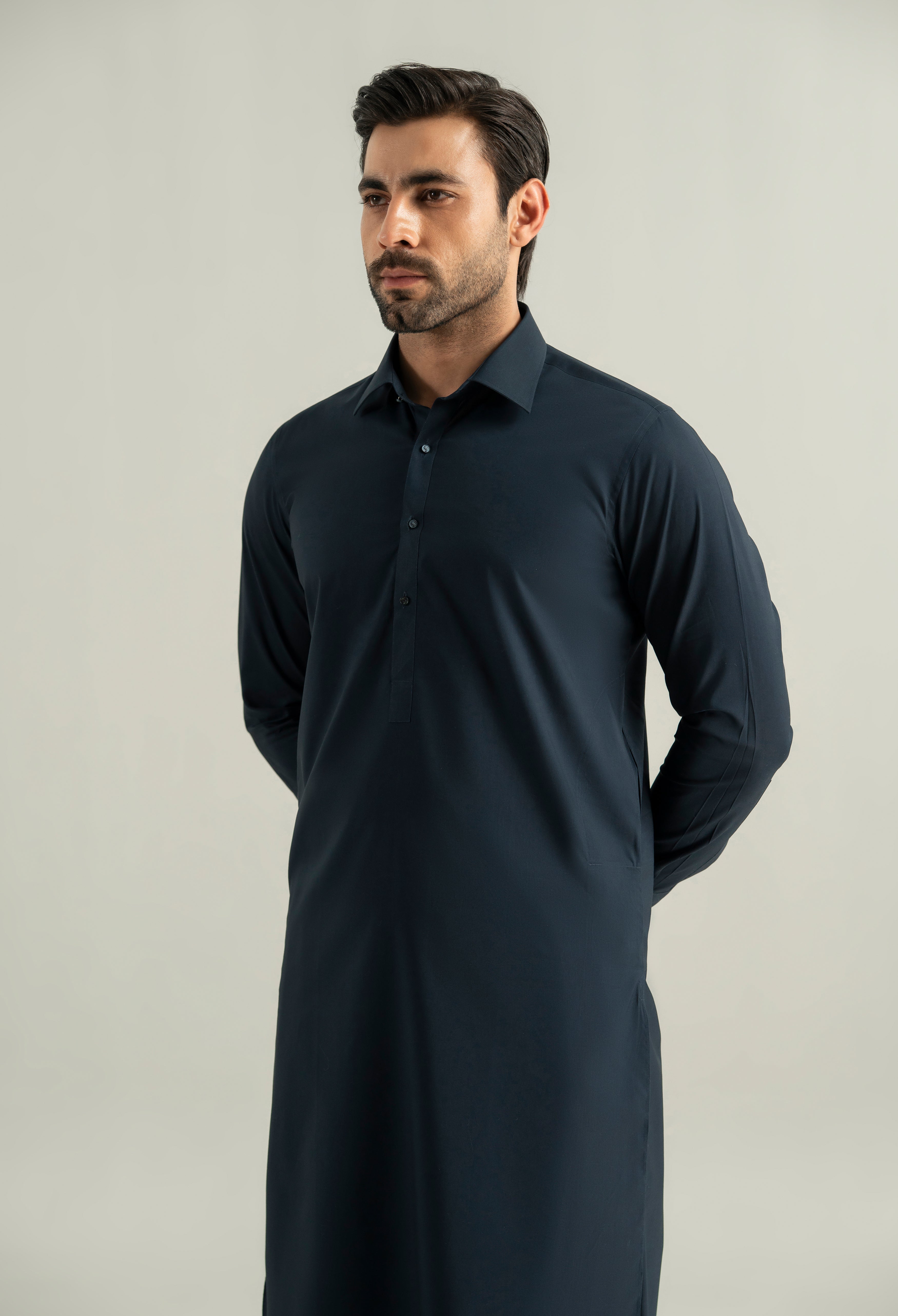Crafted for the festive season, this article features a classic shirt collar, round cuffs, a graceful round hem, and two seamlessly integrated side pockets. Its clean lines and subtle structure give it a contemporary yet timeless appeal. Thoughtful tailoring enhances its minimalist elegance, creating a garment that exudes quiet sophistication. Perfect for both formal and semi-formal occasions, it offers an elegant blend of comfort, modern style, and refined simplicity.