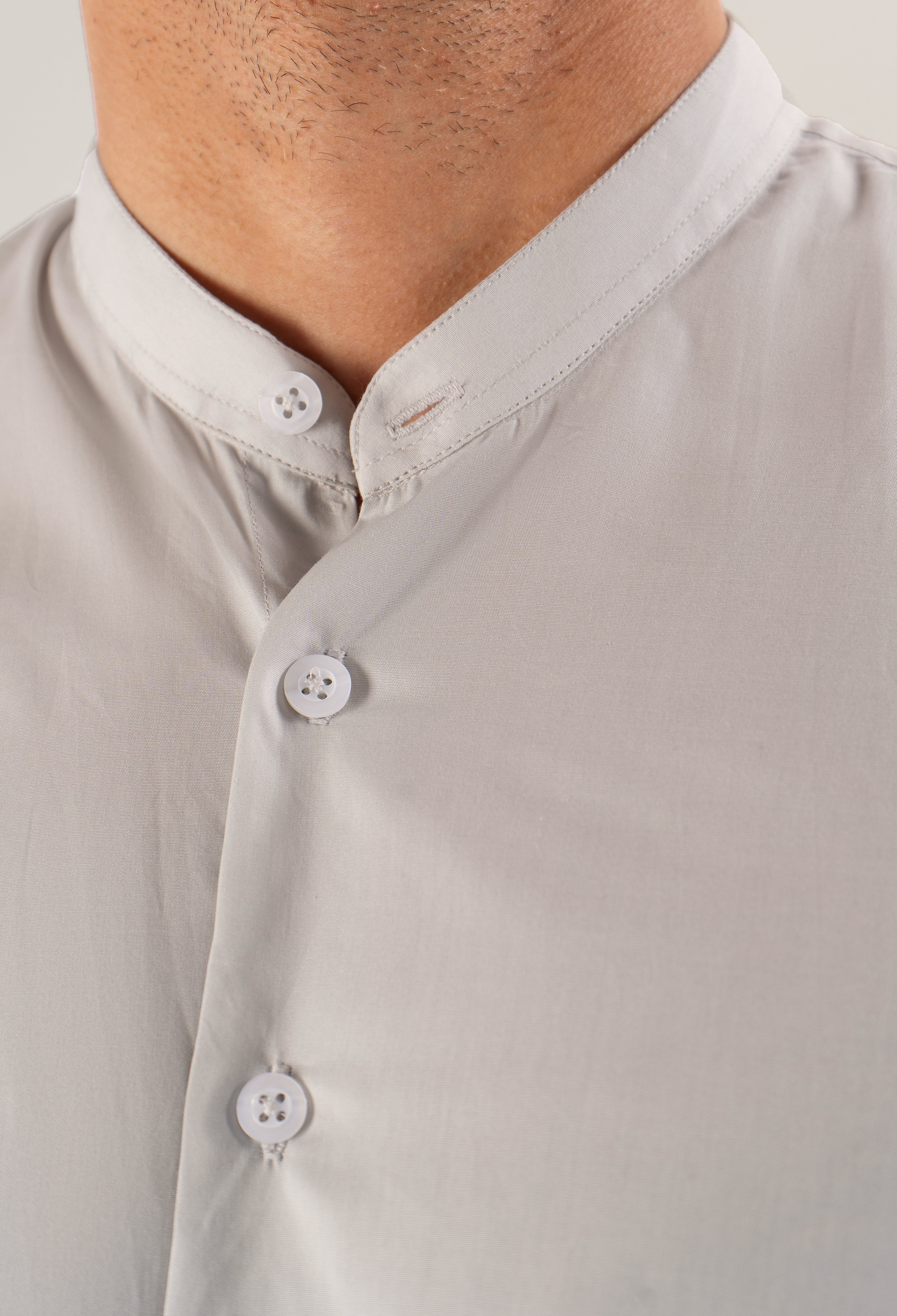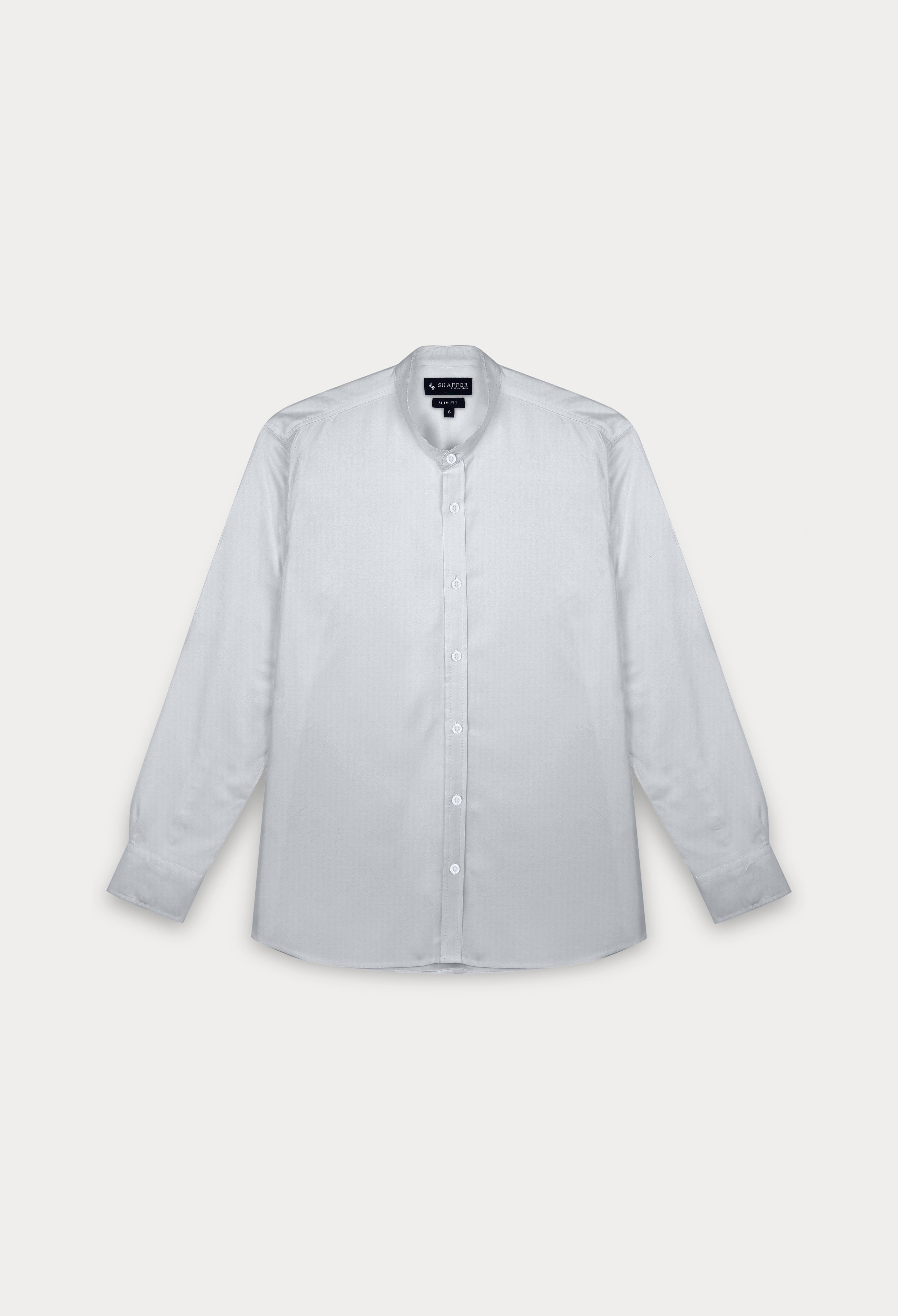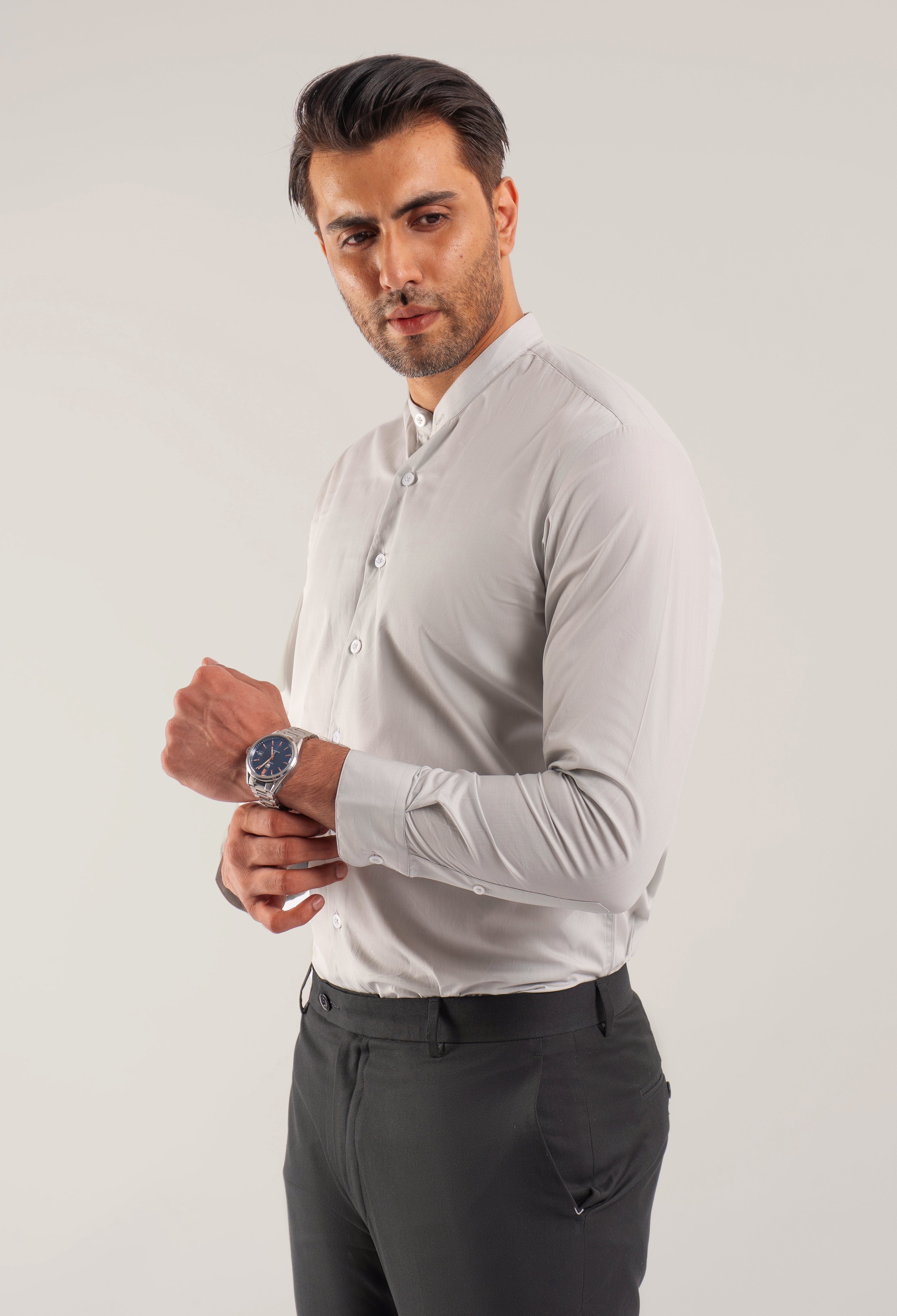 This Grey Semi Formal Shirt is crafted from 100% Cotton and includes a Band collar and slim fit styling for a semi formal look.