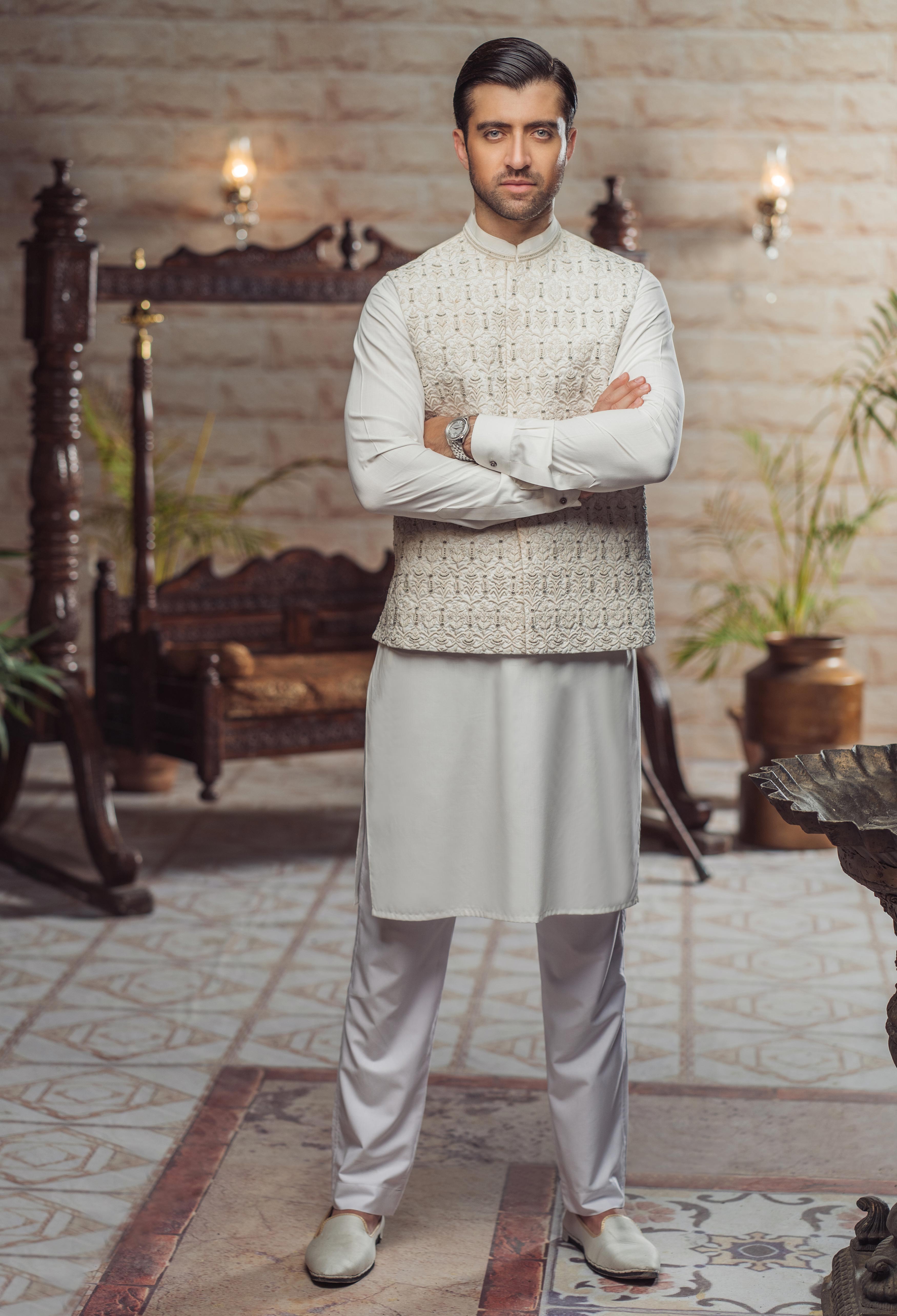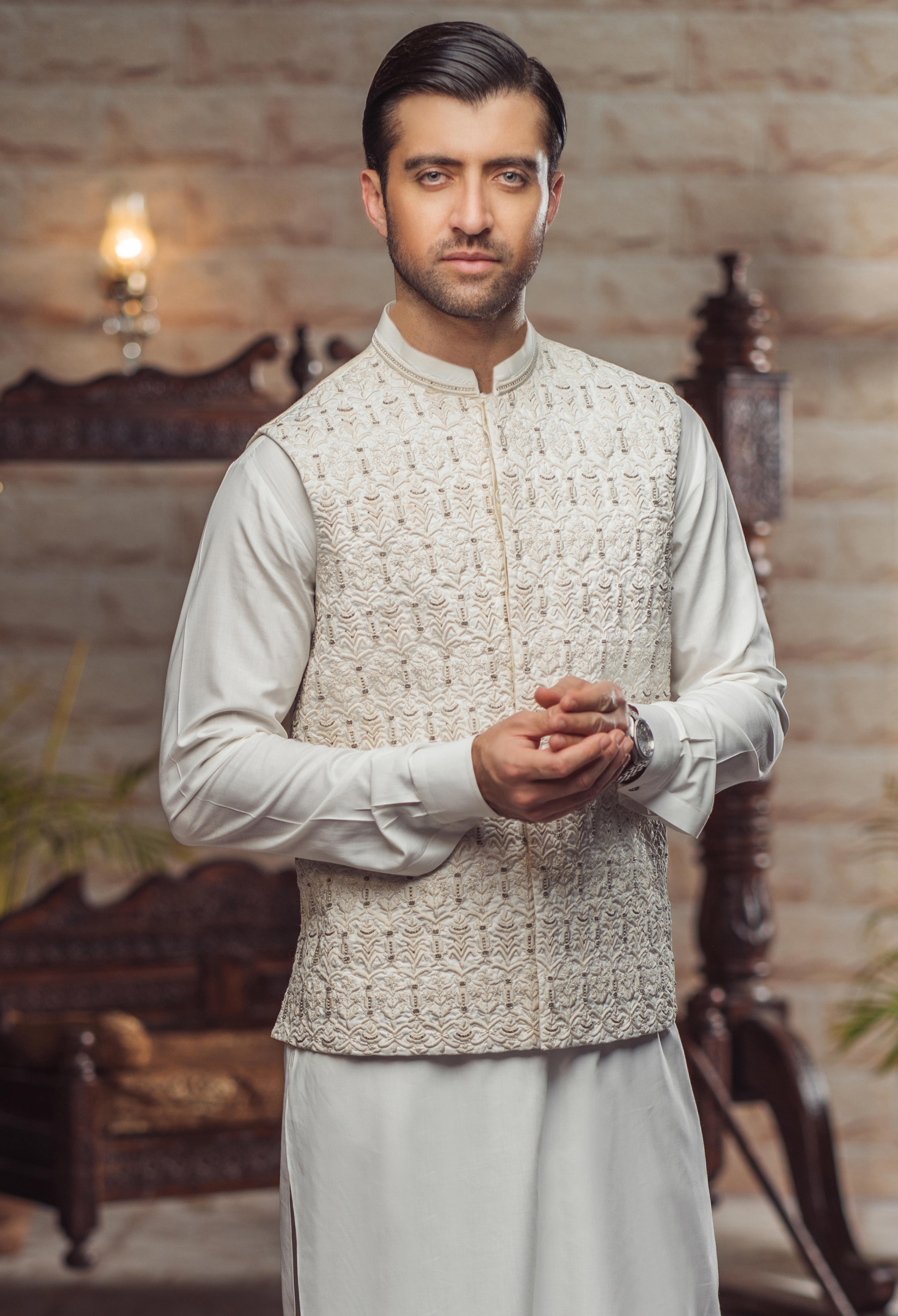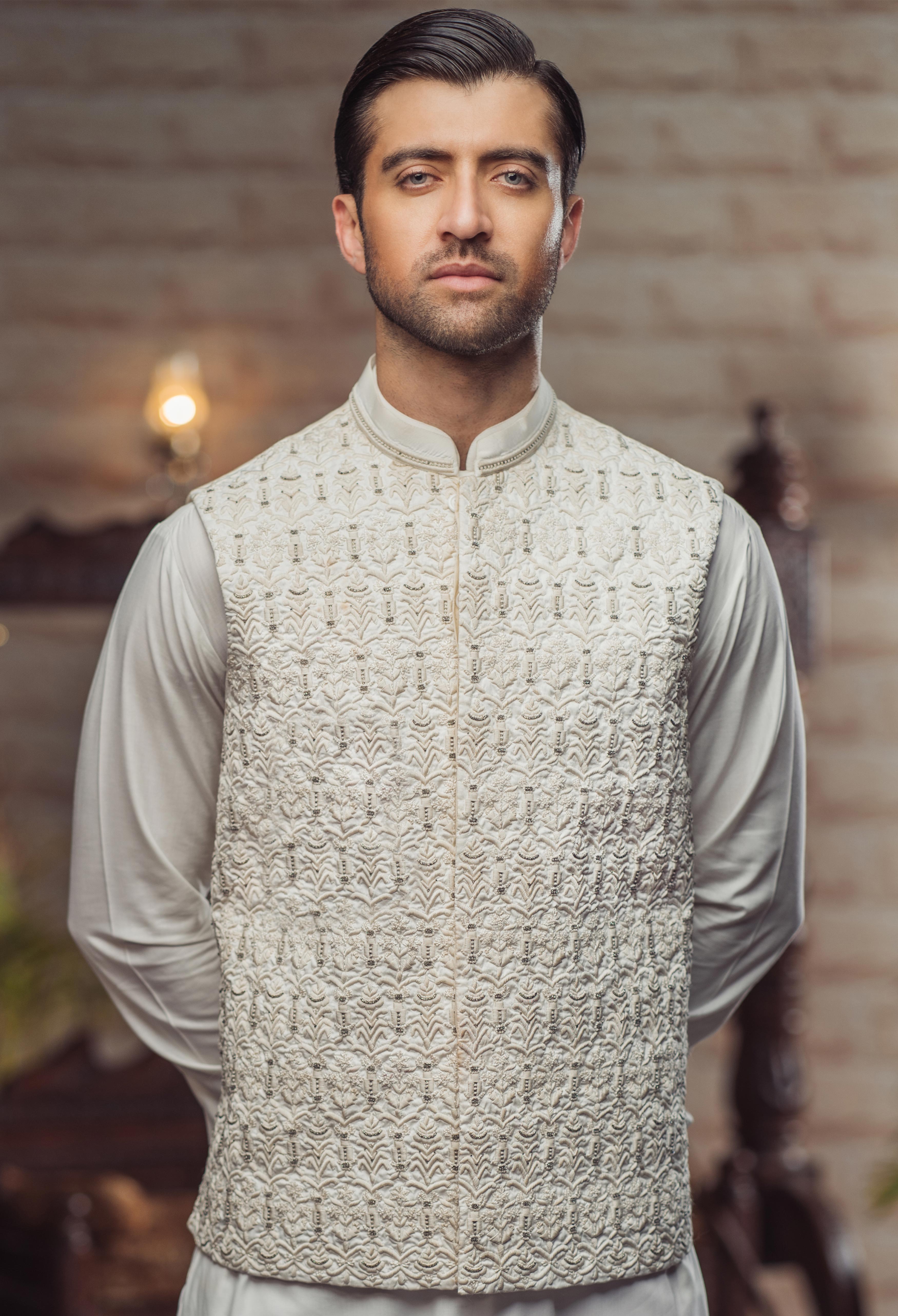 MEHRAB is an opulent art piece, featuring all-over hand-embroidered adornments atop suiting fabric, and finished with sophisticated metal buttons in the waistcoat.